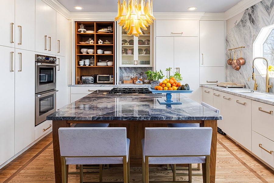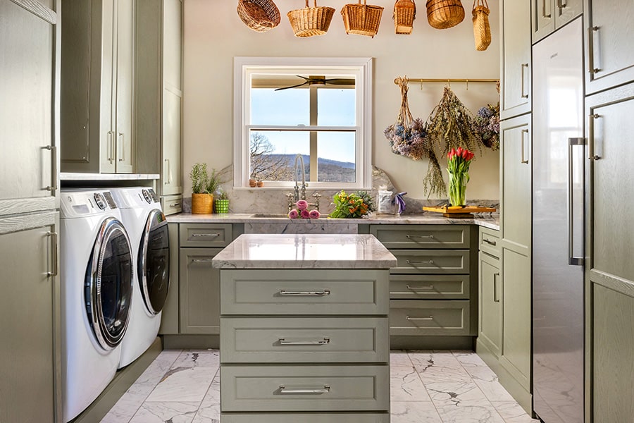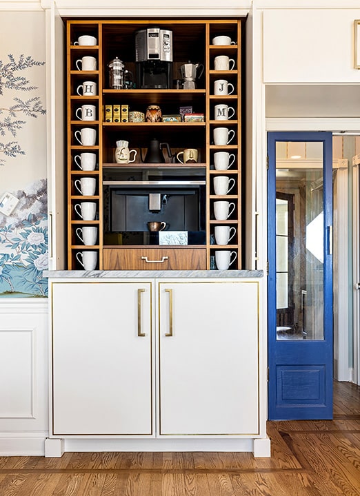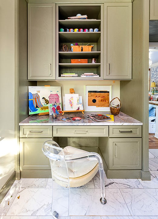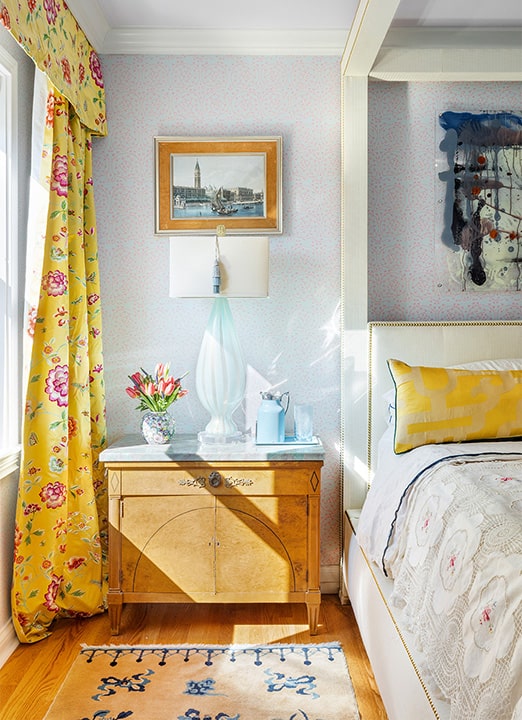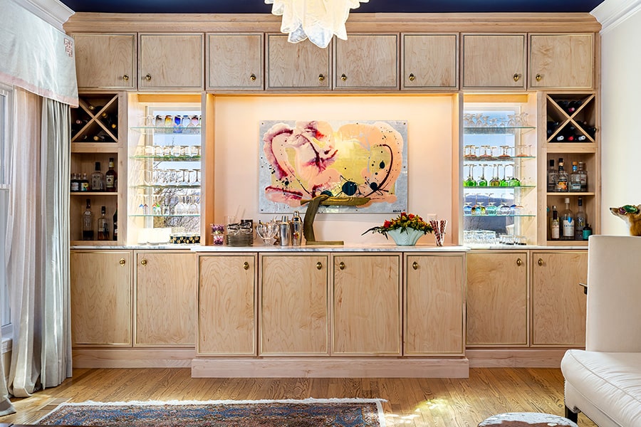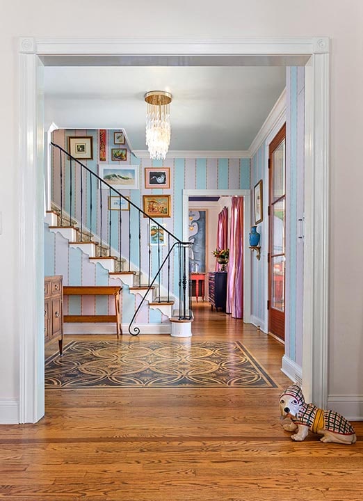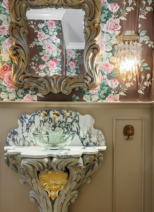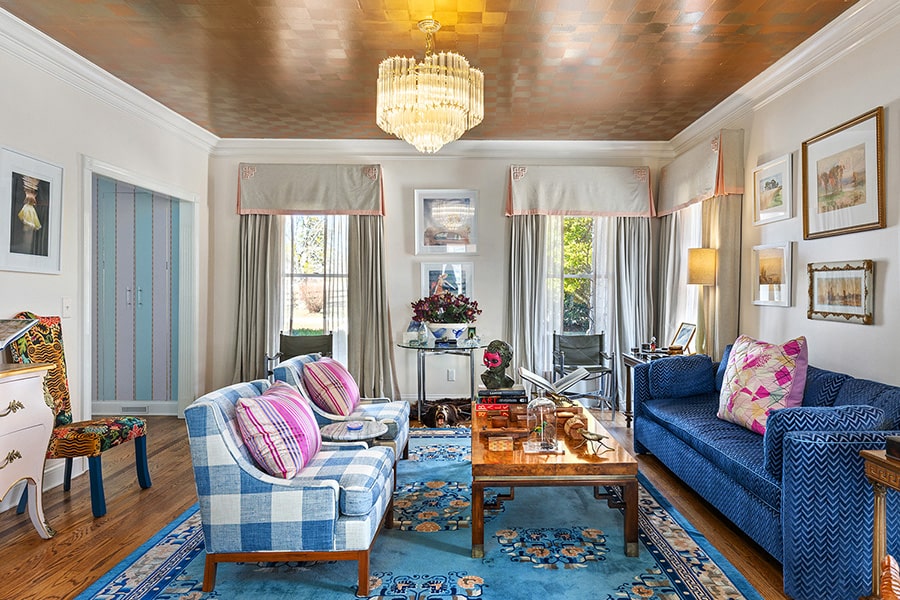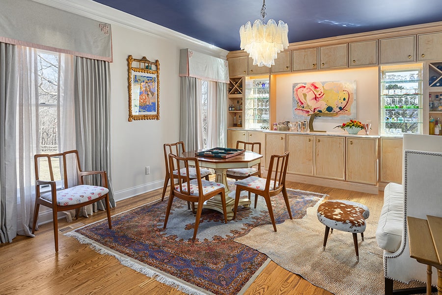 Hollywood Glam with a pastoral sensibility, a mash-up of styles, colors, and moods were used to create an intensely personal and curated home. Numerous collections of bibelot were incorporated giving one the sense of a well-traveled life. Art from all periods and styles furthered the impression of wild juxtaposition. Darker colors were used to create a cozy, welcoming feeling in this home of collectors.